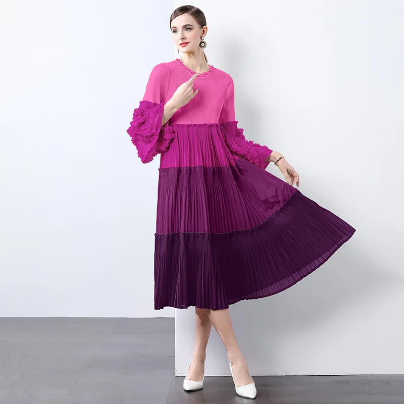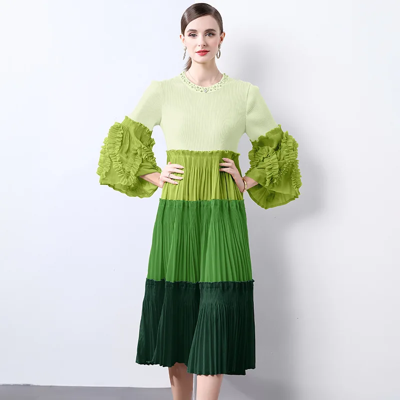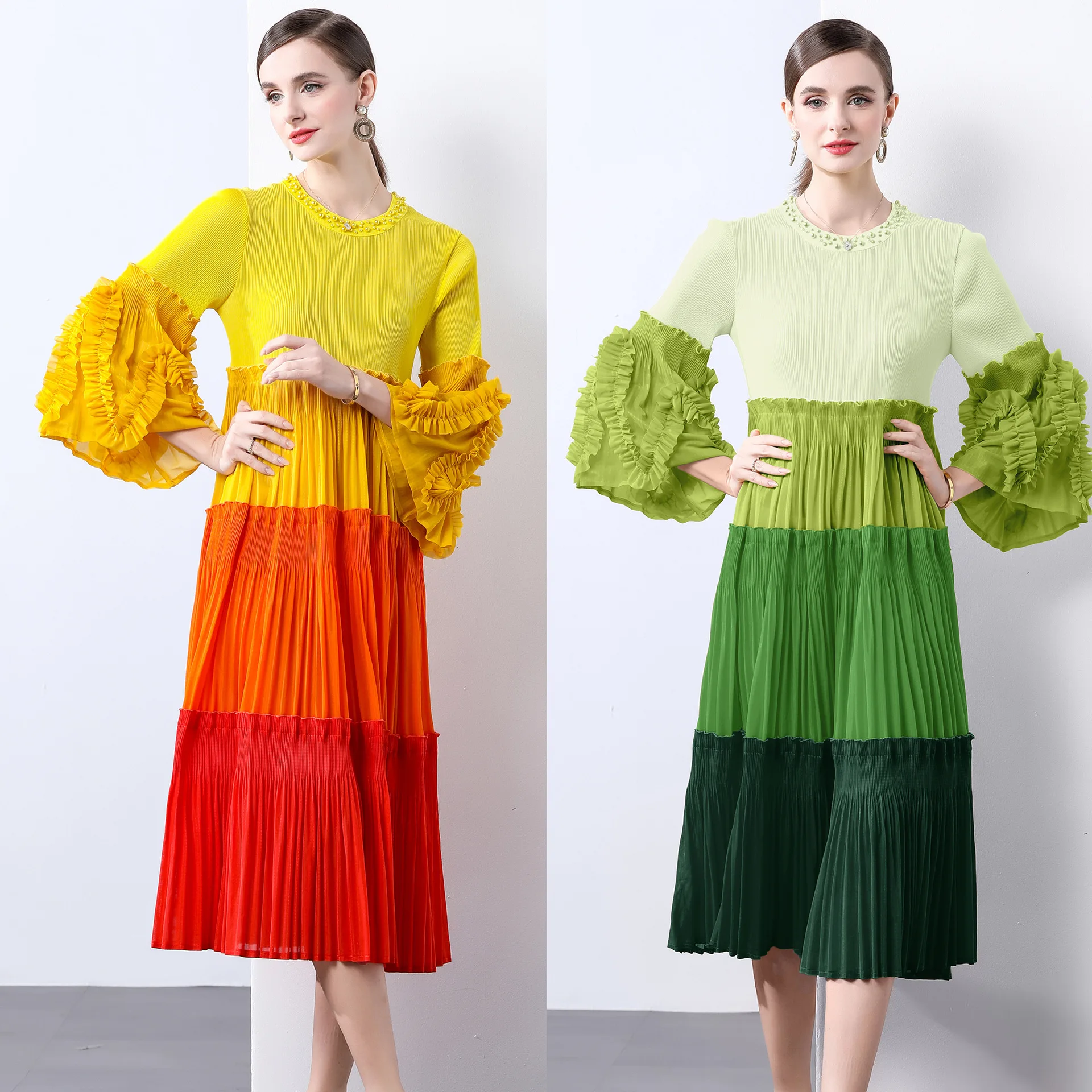 Trumpet Sleeve Dress for Women Chic Elegant Long Skirt Contrasting Color Casual Dresses Market Wholesalers